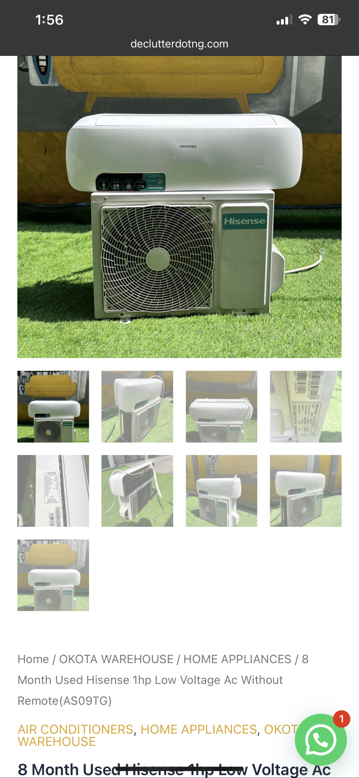 8 Month Used Hisense 1hp Low Voltage Ac Without Remote(AS09TG)