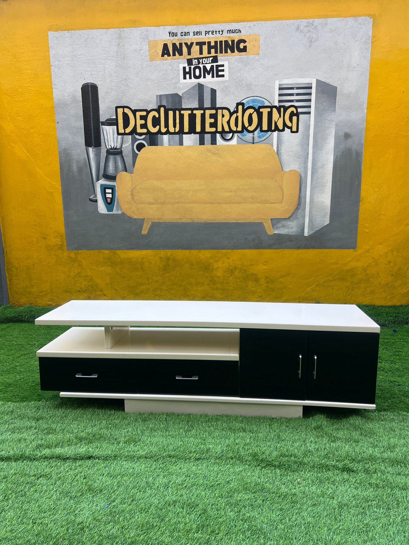 Barely Used Top Quality Imported White And Black Glossy Adjustable Tv Console With 3 Drawers